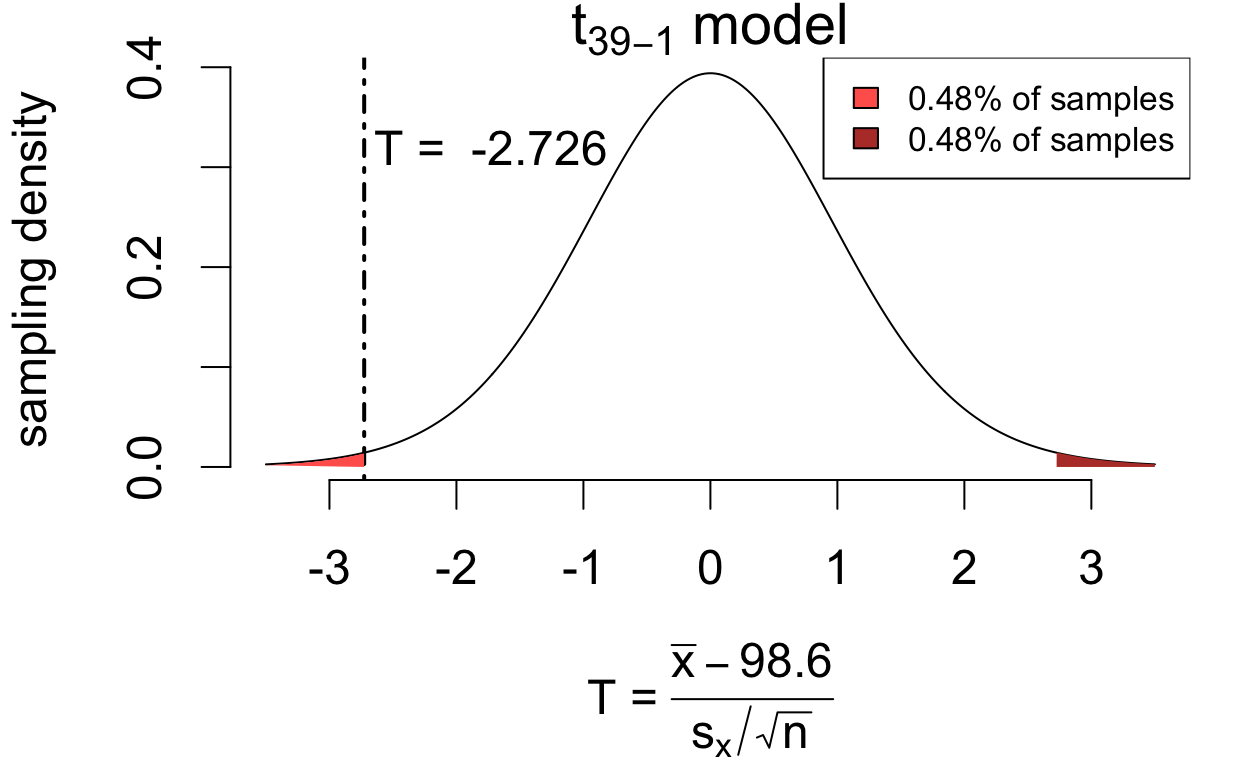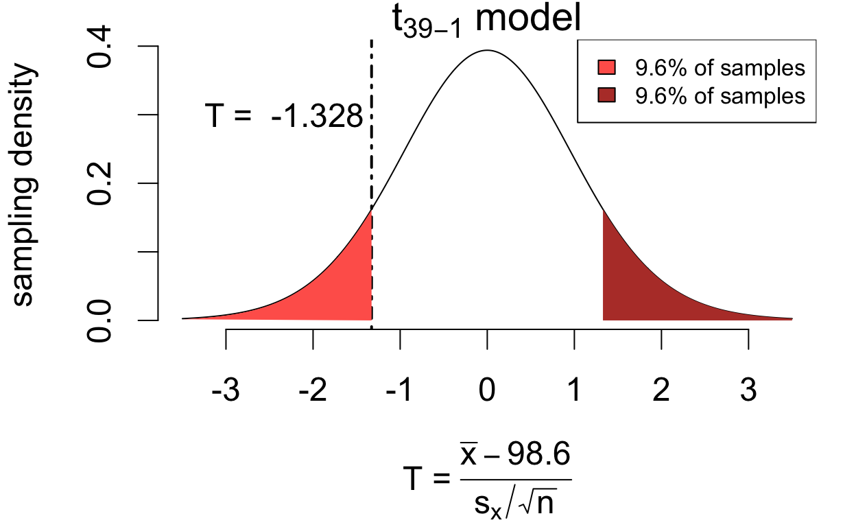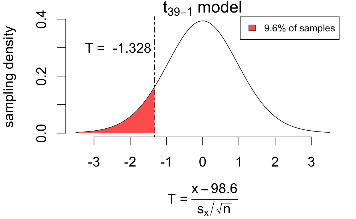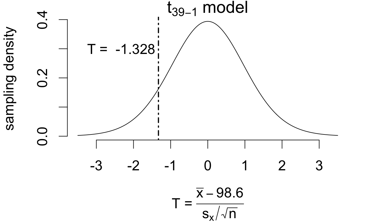 If the population mean is in fact 98.6°F then \[T = \frac{\bar{x} - 98.6}{s_x/\sqrt{n}}\qquad\left(\frac{\text{estimation error}}{\text{standard error}}\right)\] has a sampling distribution that is well-approximated by a \(t_{39 - 1}\) model.