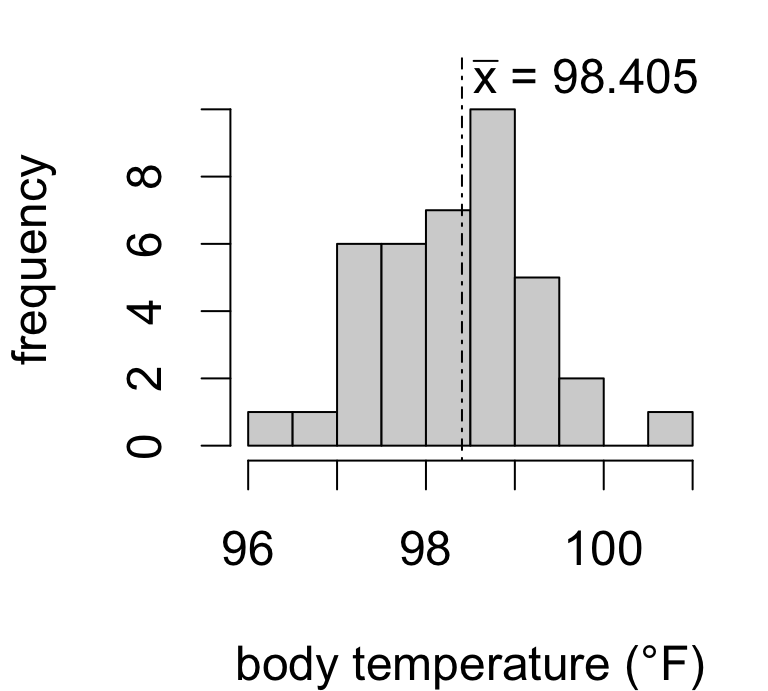 \[T = \frac{\bar{x} - 98.6}{s_x/\sqrt{n}} \qquad\left(\frac{\text{estimation error}}{\text{standard error}}\right)\]