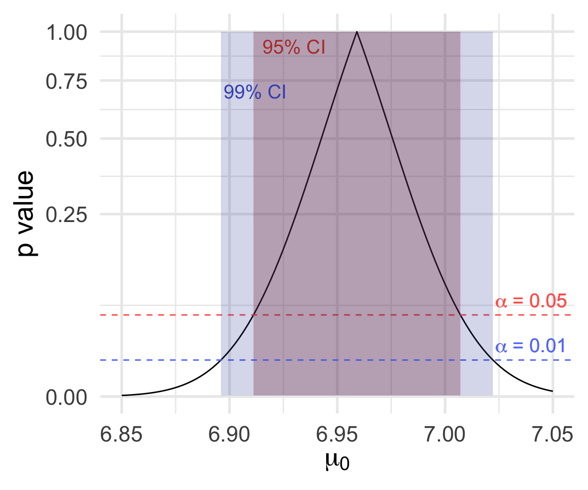 A level \(\alpha\) test rejects \(H_0: \mu = \mu_0\) exactly when \(\mu_0\) is outside the \((1 - \alpha)\times 100\)% confidence interval for \(\mu\).