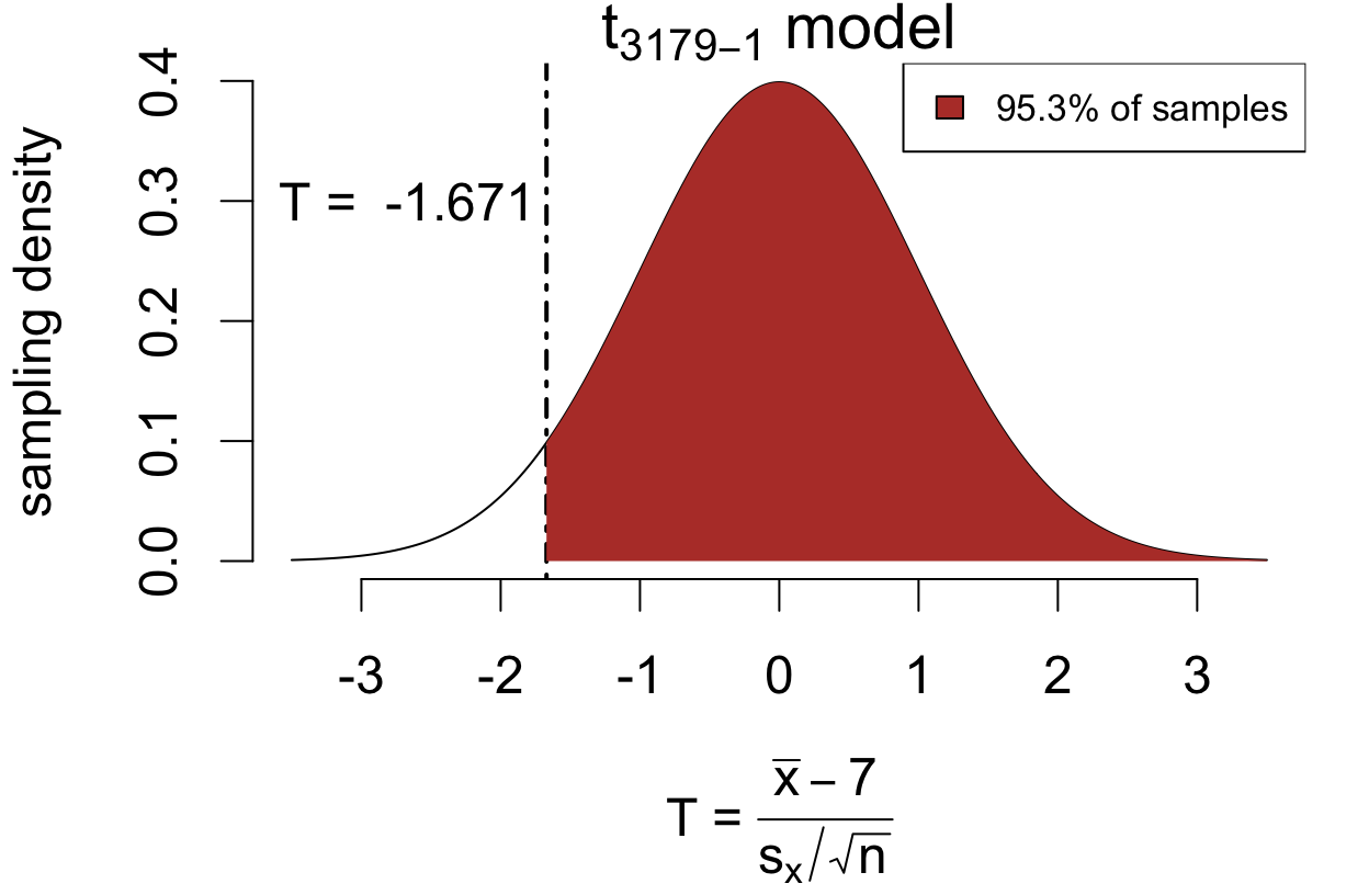 \[ T = \frac{\bar{x} - 7}{SE(\bar{x})} = -1.671 \]