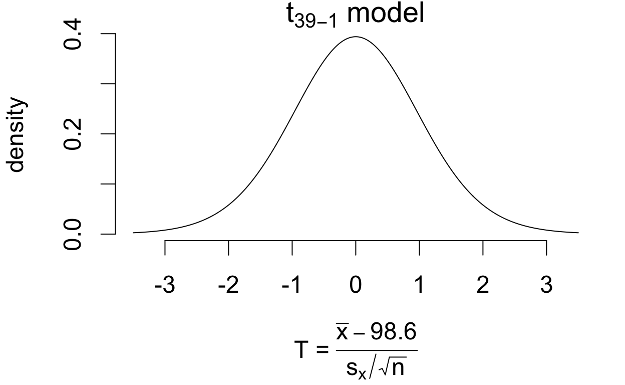 If the population mean is in fact 98.6°F then \[T = \frac{\bar{x} - 98.6}{s_x/\sqrt{n}} \qquad\left(\frac{\text{estimation error}}{\text{standard error}}\right)\] has a sampling distribution that is well-approximated by a \(t_{39 - 1}\) model.