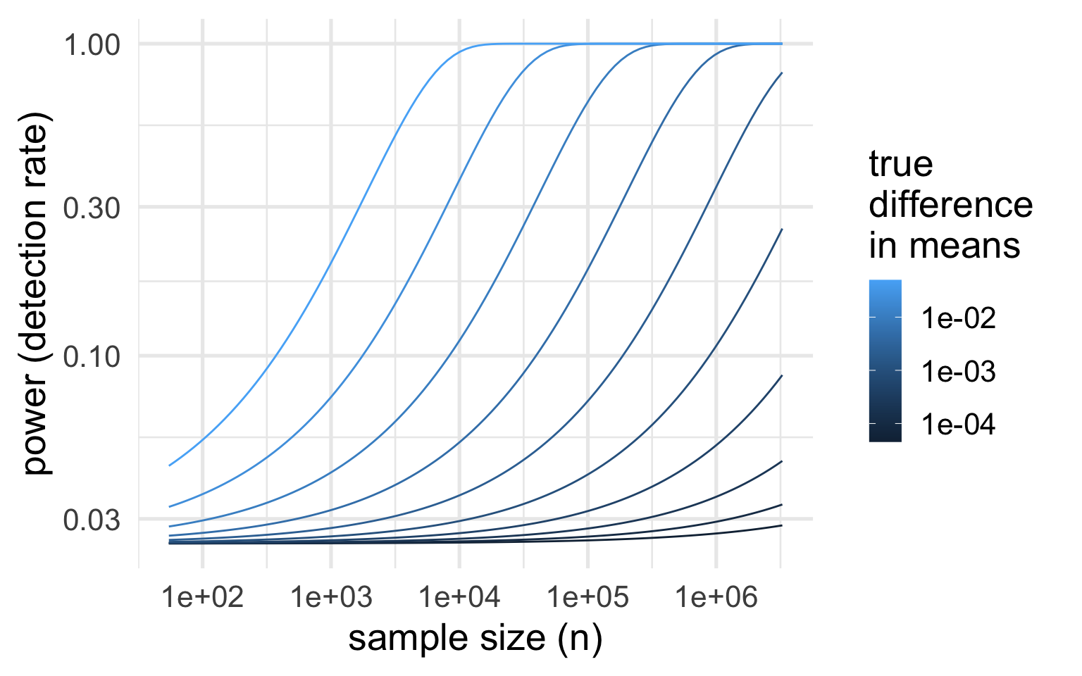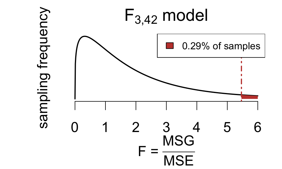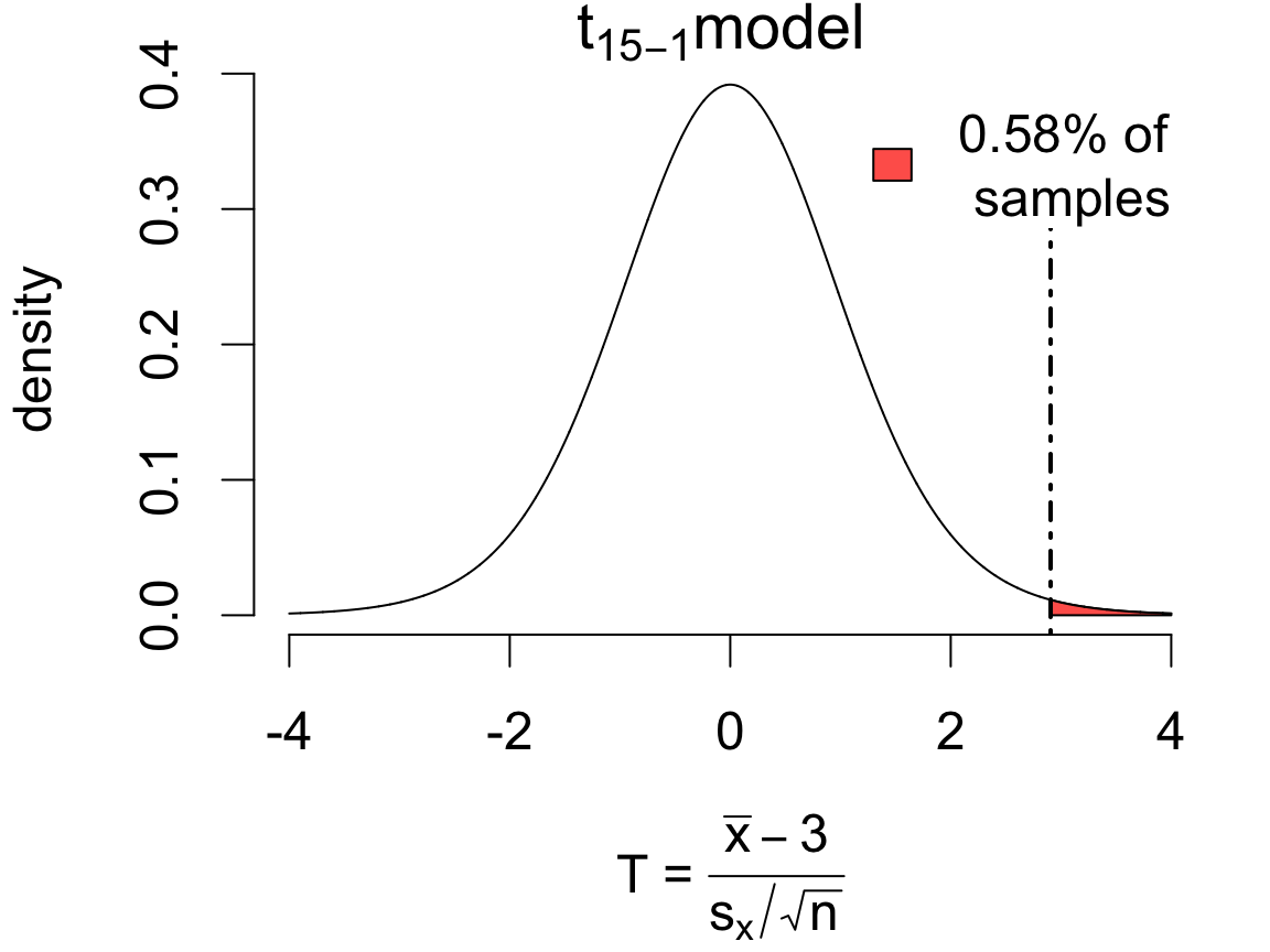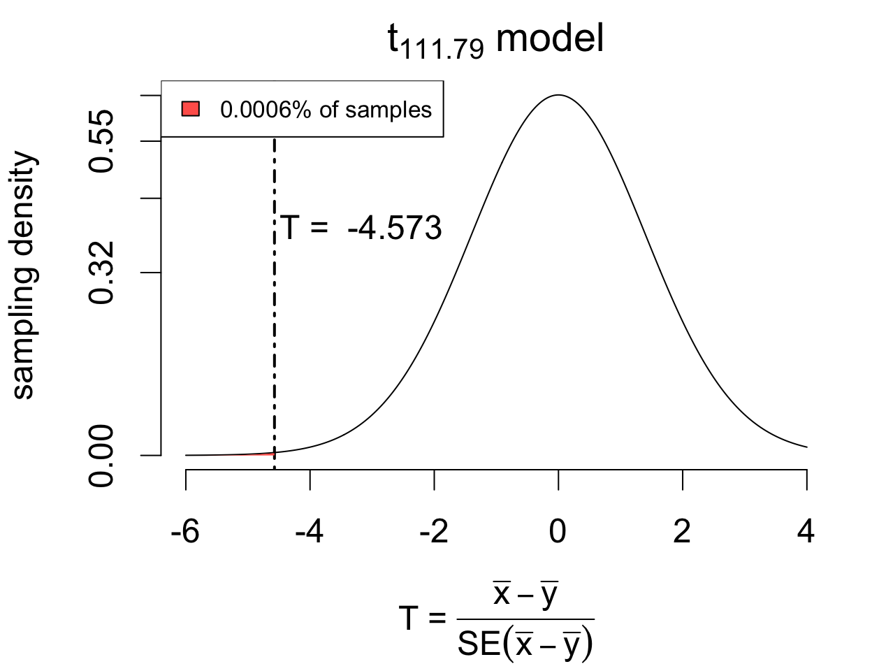 The sampling frequency we’re calculating above is called a p-value: the proportion of samples for which the test statistic, under \(H_0\), would exceed the observed value.